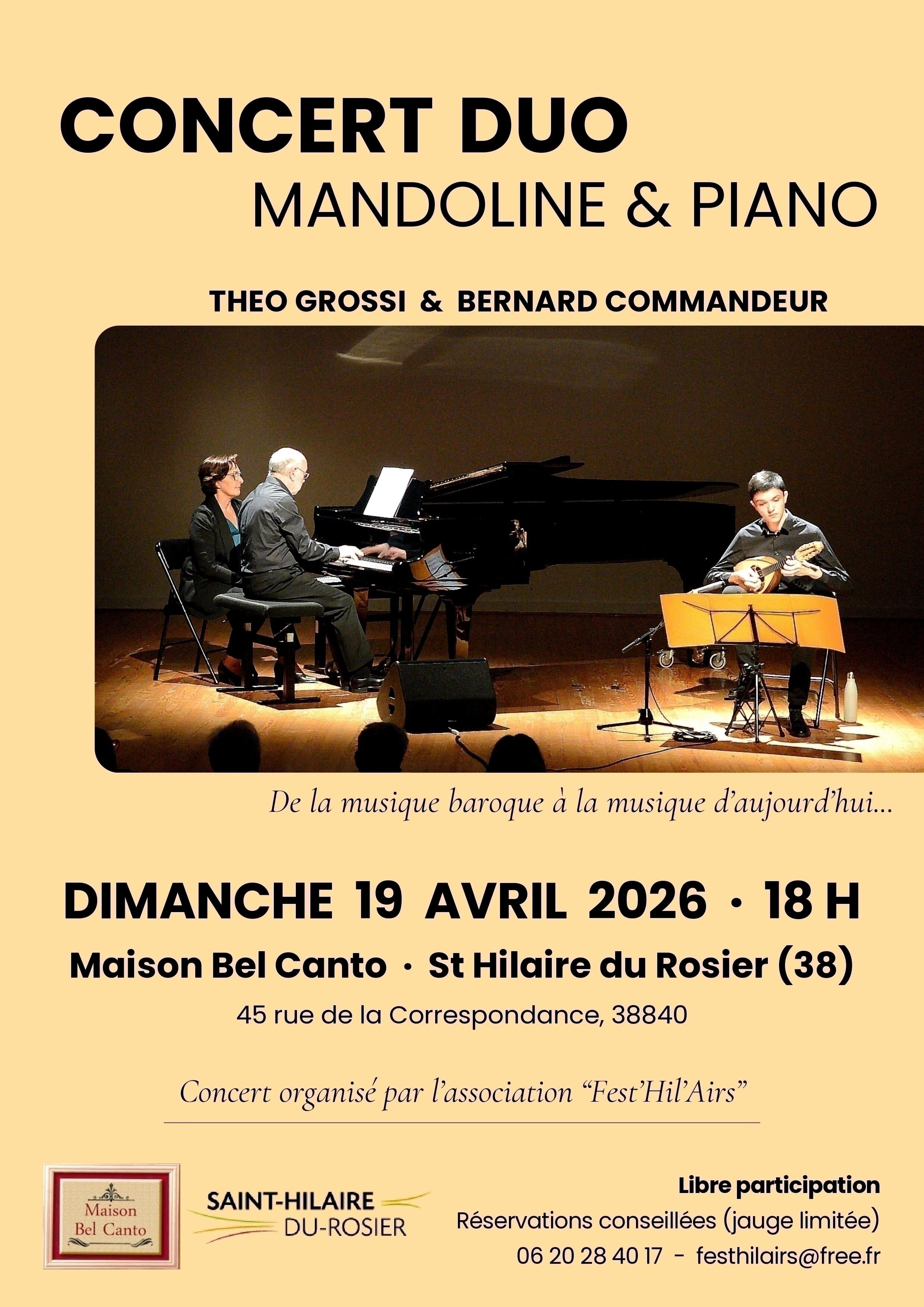 L'association Fest'Hil'Airs vous convie à un voyage éclectique en duo de mandoline–piano avec le talentueux mandoliniste grenoblois Théo Grossi, Premier Prix 2025 du Concours international de Modène, accompagné du pianiste Bernard Commandeur.